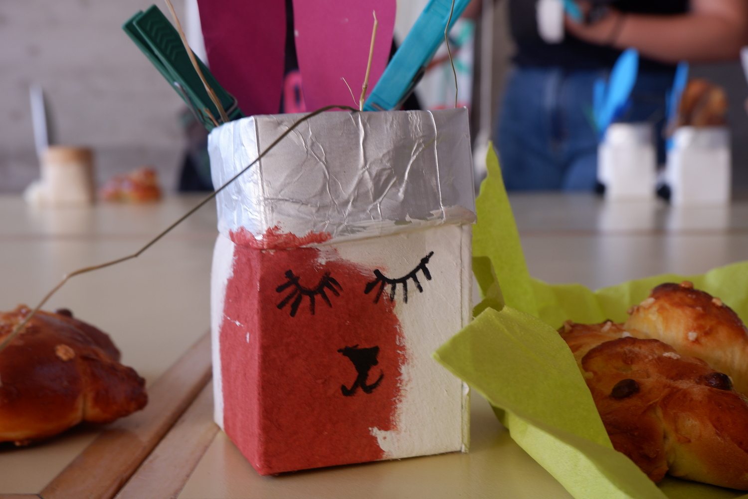 Fleißig wurden Tetra-Packungen verziert und zu Osternestern umgewandelt. Kreativ konnte man außerdem beim Bemalen von Ostereiern werden. Wir Leiter*innen waren zudem ganz begeistert von den süßen Osterhasen (und anderen kreativen Dingen), die aus dem vorbereiteten Zopfteig entstanden sind.